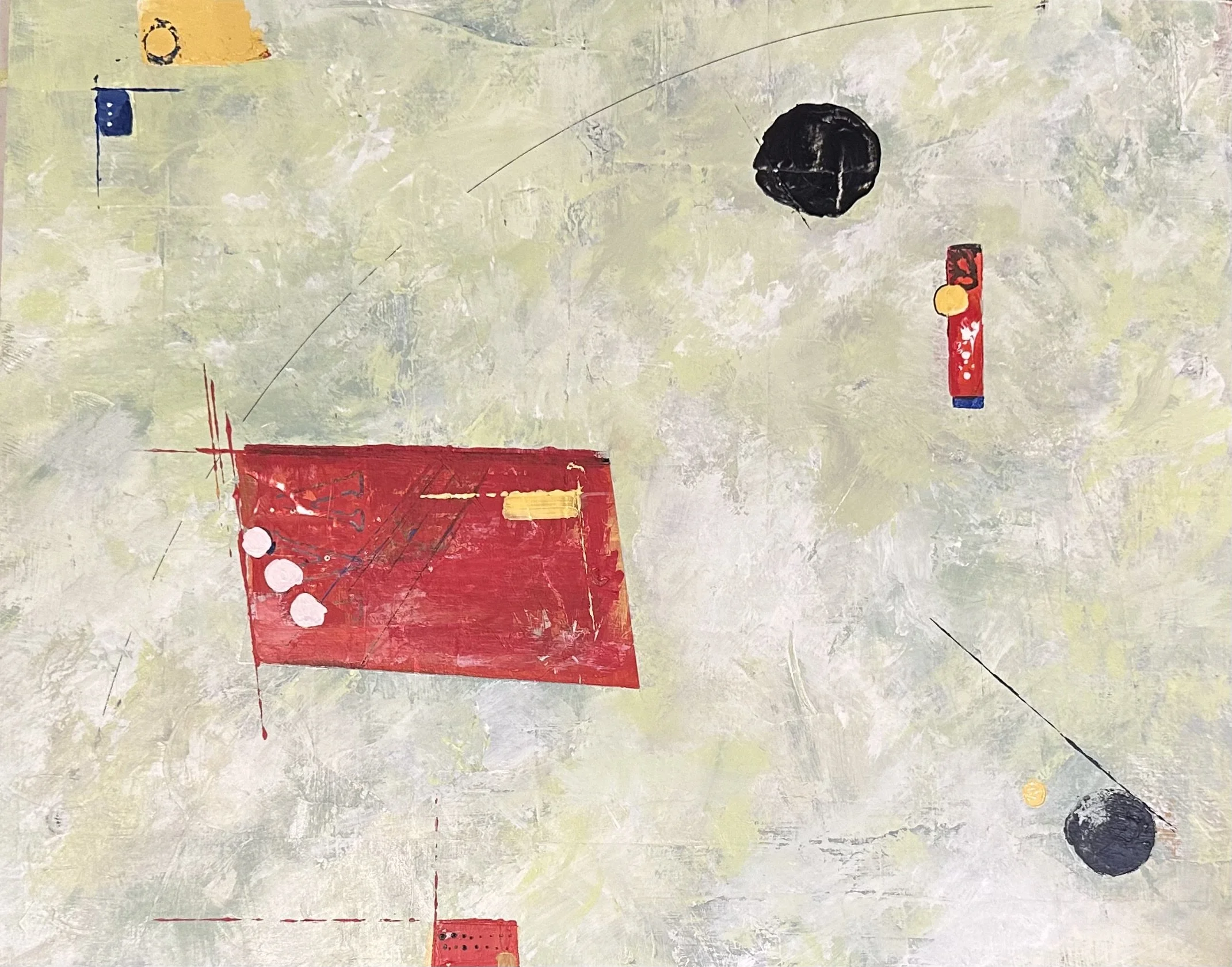 “Measure of Silence” explores the balance between presence and pause — the rhythm that exists between what is spoken and what is held. The bold red and black forms move through a soft, weathered field of color, evoking fragments of thought, sound, or memory suspended in stillness. Simplicity holds power.This work continues Shel’s reflection of hope and space through a quiet lens. The open space is intentional — an act of restraint, allowing breath and ambiguity to hold their own gravity. Each line, dot, and mark carries the memory of motion, yet resists completion, inviting viewers to listen rather than look.