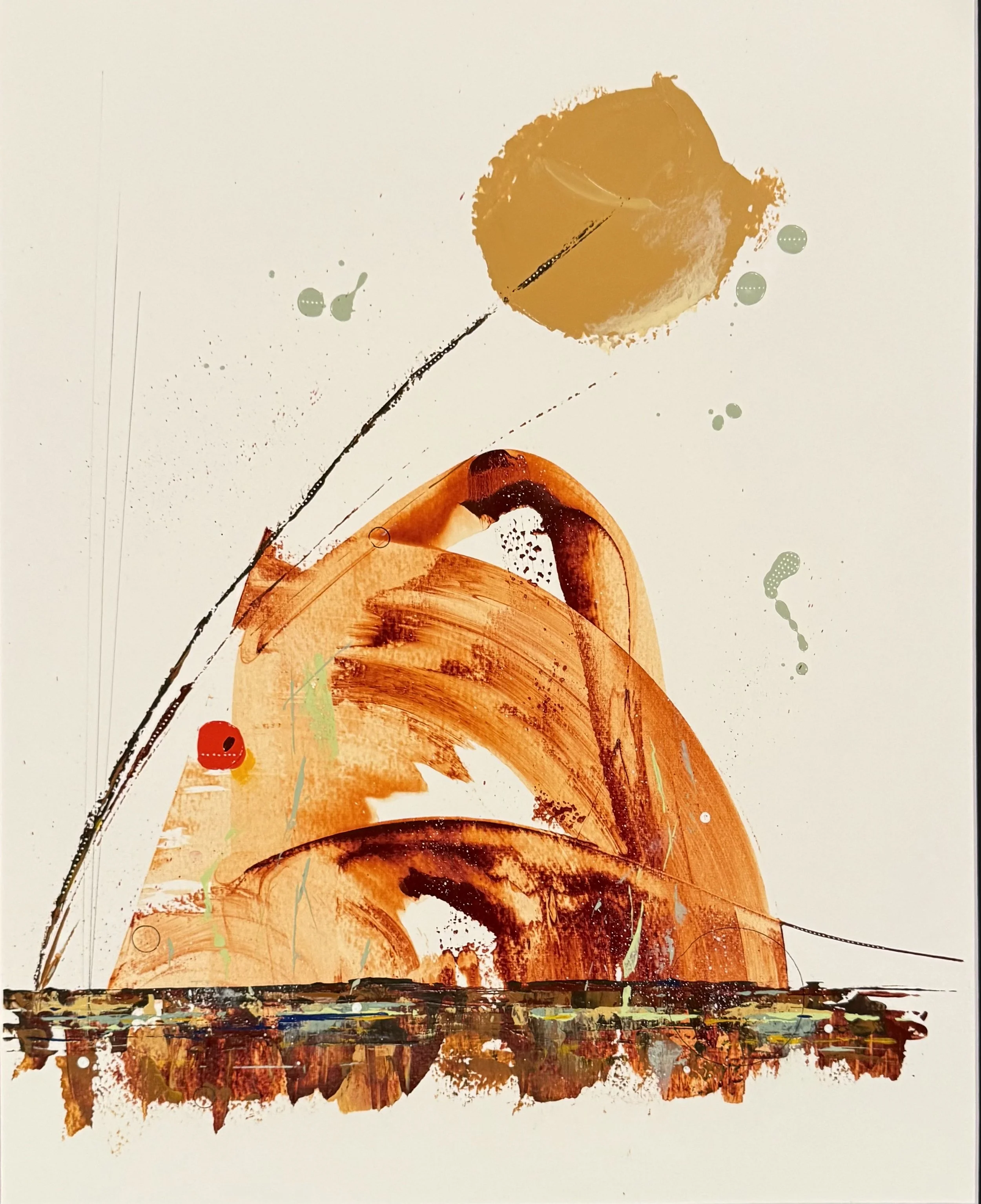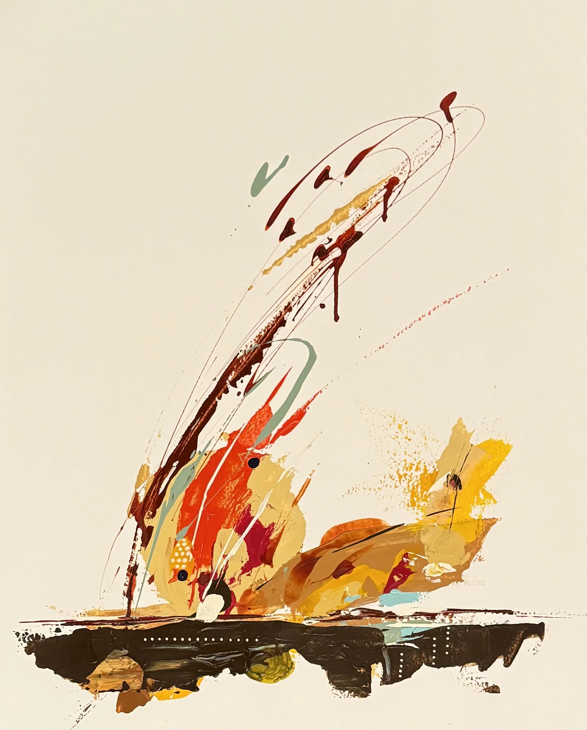 Sandstorm Rising, sweeping arcs of ochre and crimson collide in a dynamic burst of energy, capturing the fierce beauty of a high desert storm. The composition evokes the swirling grit and unrelenting wind-driven sand, immersing the viewer in both the power and the transience of the moment.