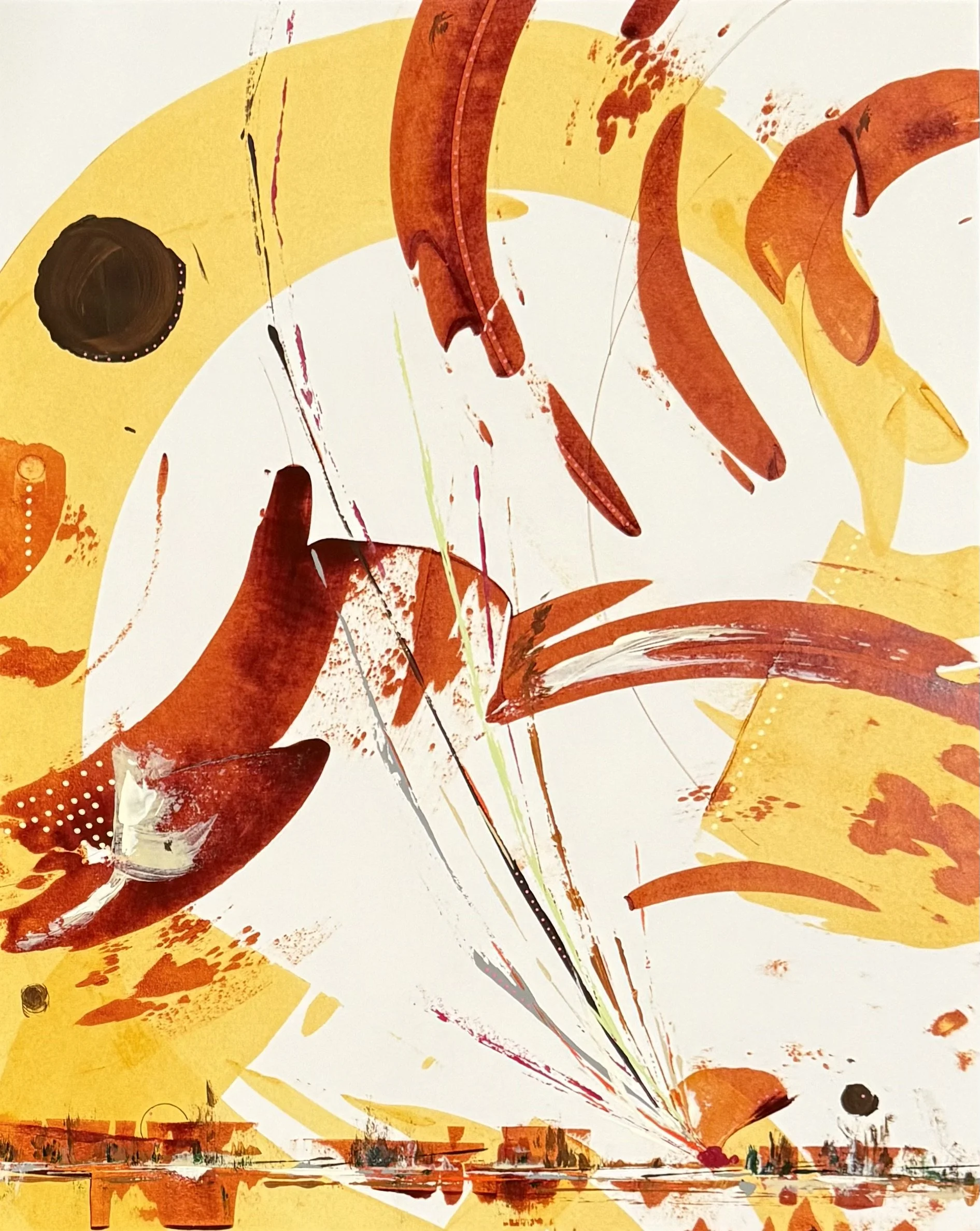 Awakening celebrates the vibrant life that thrives in the high desert. Bursts of red, gold, and earth tones rise like morning heat, while fluid arcs suggest the motion of birds, insects, and creatures emerging with the day. The artist honors the delicate balance of survival and beauty in this rugged, sunlit ecosystem.
